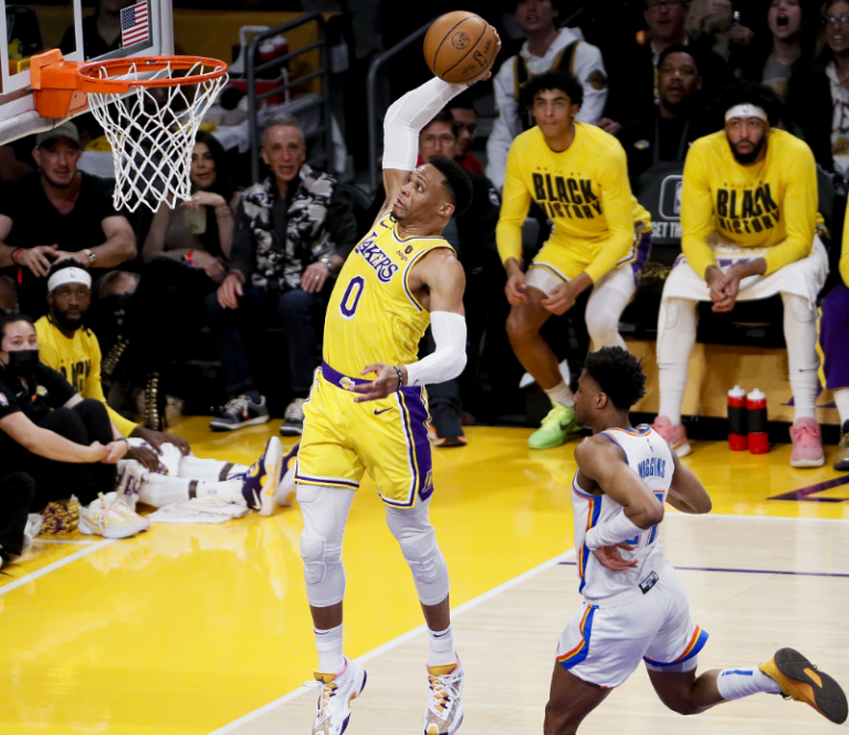 NBA 更新:吉祥坊洛杉矶湖人队的拉塞尔威斯布鲁克在对阵俄克拉荷马城雷霆队的比赛中扣篮