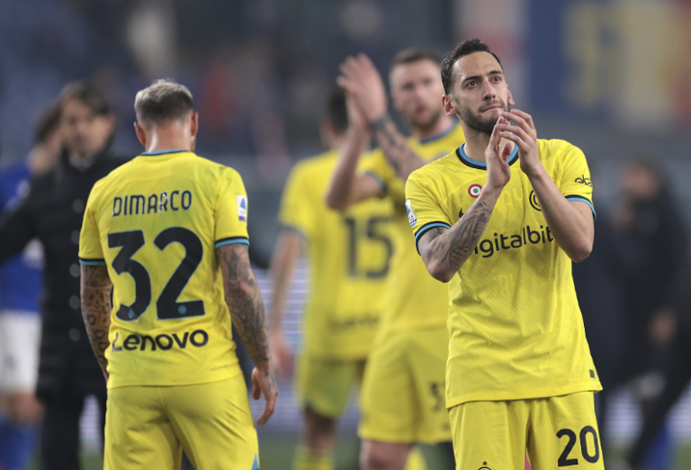 国际米兰球员在意甲联赛终场哨响后为路易吉·费拉里斯鼓掌。