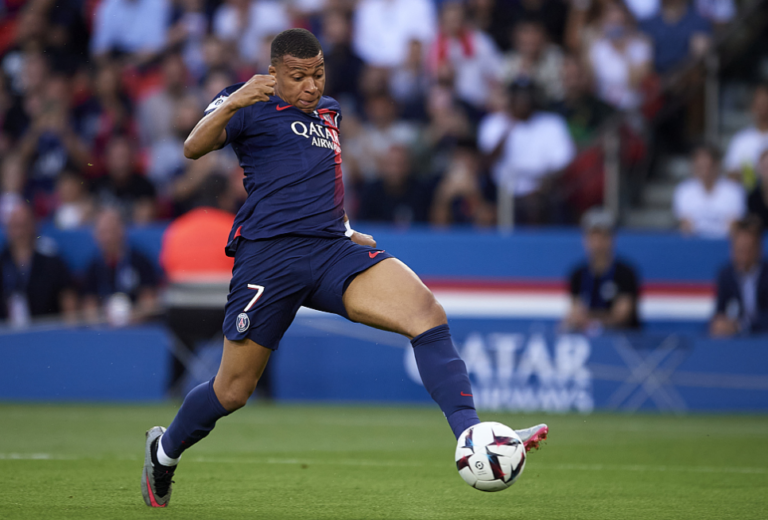吉祥坊巴黎圣日耳曼队的基利安·姆巴佩在巴黎王子公园球场对阵克莱蒙足队的法甲比赛中带球。
